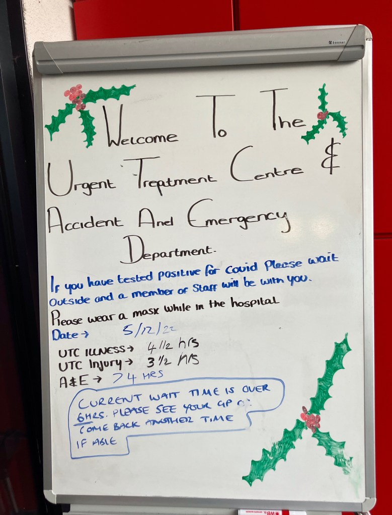 On Wednesday the 8th of December 2022, at approximately 1400 hours, I turned up to my local NHS Hospital. It was packed in the car park and A&E was heaving inhumanly with a suggested 6 hour wait. I was greeted by this sign. You have to read it to believe it. The sign included a suggestion to “PLEASE SEE YOUR GP”. Note even the date was incorrect. A lady had just finished writing on the board and it appears to say a waiting time of 74 hours.