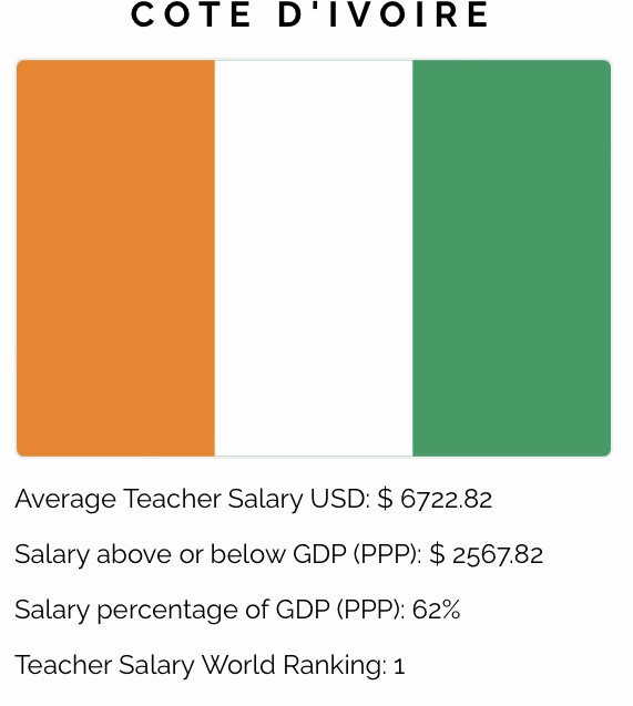 My guidance to the teachers is to leave the country and work abroad, where the teacher’s pay is higher than the measure of the size and health of their country’s economy. Do not head to Venezuela, where the average annual teacher’s salary is £159 annually, but do head to Cote D’Ivoire. Cote D’Ivoire is at the top of the world’s leaderboard and has a massive 62 % salary percentage higher than its measure of the size and health of a country’s economy. Cote D’Ivoire is on the West Coast of Africa, consistently above 23 degrees; known to have beautiful beaches and welcoming locals. In Layman’s terms, if teachers want a better life, stop the strikes and book your flights to Cote D’Ivoire today!